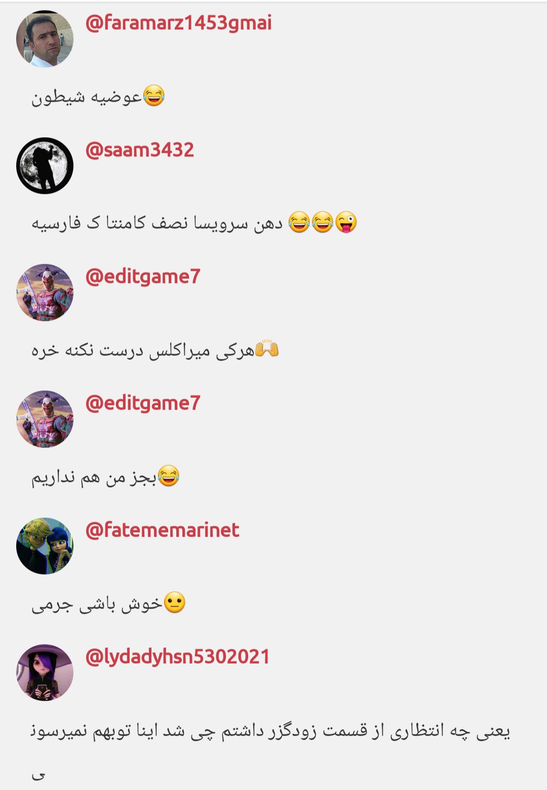 ماریا: یه نصیحت دوستانه: بیخودی از الناز متنفر نباشید شاید علت اینکه اون رفتارش با مرینت و اینا خوب نیست اینکه اون قبلا درد زیادی رو کشیده. یا به عبارتی زندگی ای پر از درد و رنج رو تحمل کرده. حالا خود دانید.