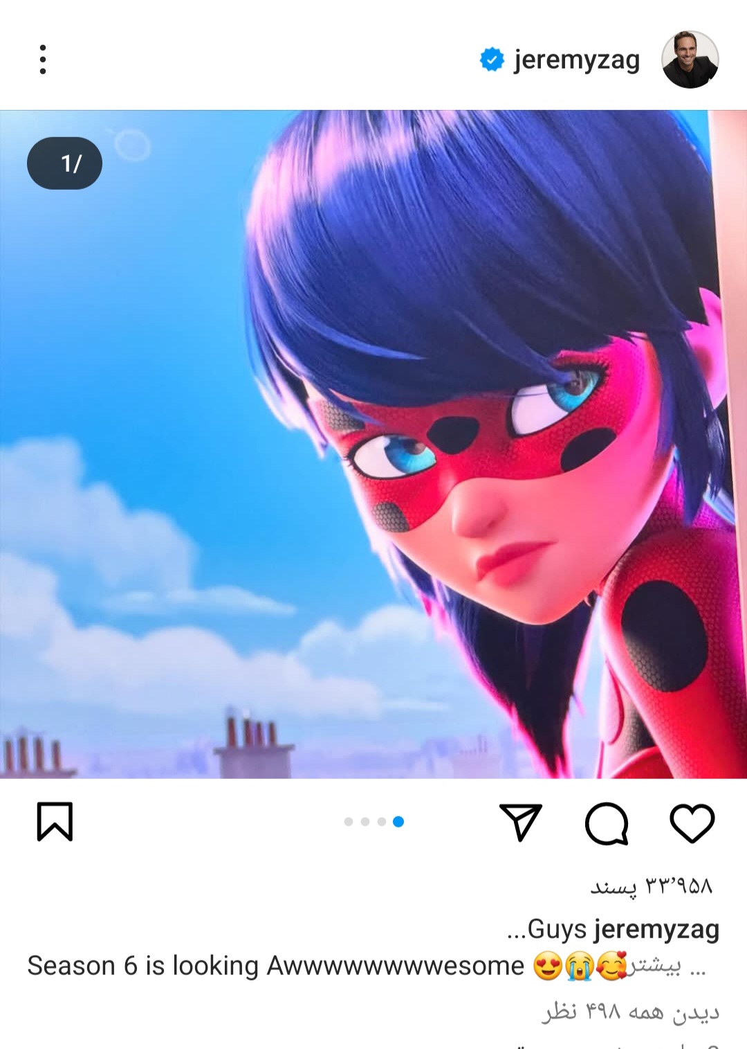 8 خرداد 1403 · · سلام من اومدم با ی خبر توپ خب آمادگی ها فصل شش داره تموم میشه و طبق گفته های قبلی اینا سه سال پرش زمانی دارن و مرینت و آدرین الان ۱۷ سالشون شده و قیافه هاشون تغییر کرده و بالاخره اولین عکس از لیدی باگ منتشر کرد و من الان عکس این بالا گذاشتم😁 نظرتون رو راجب به لیدی جدید برام کامنت کنید ♥️