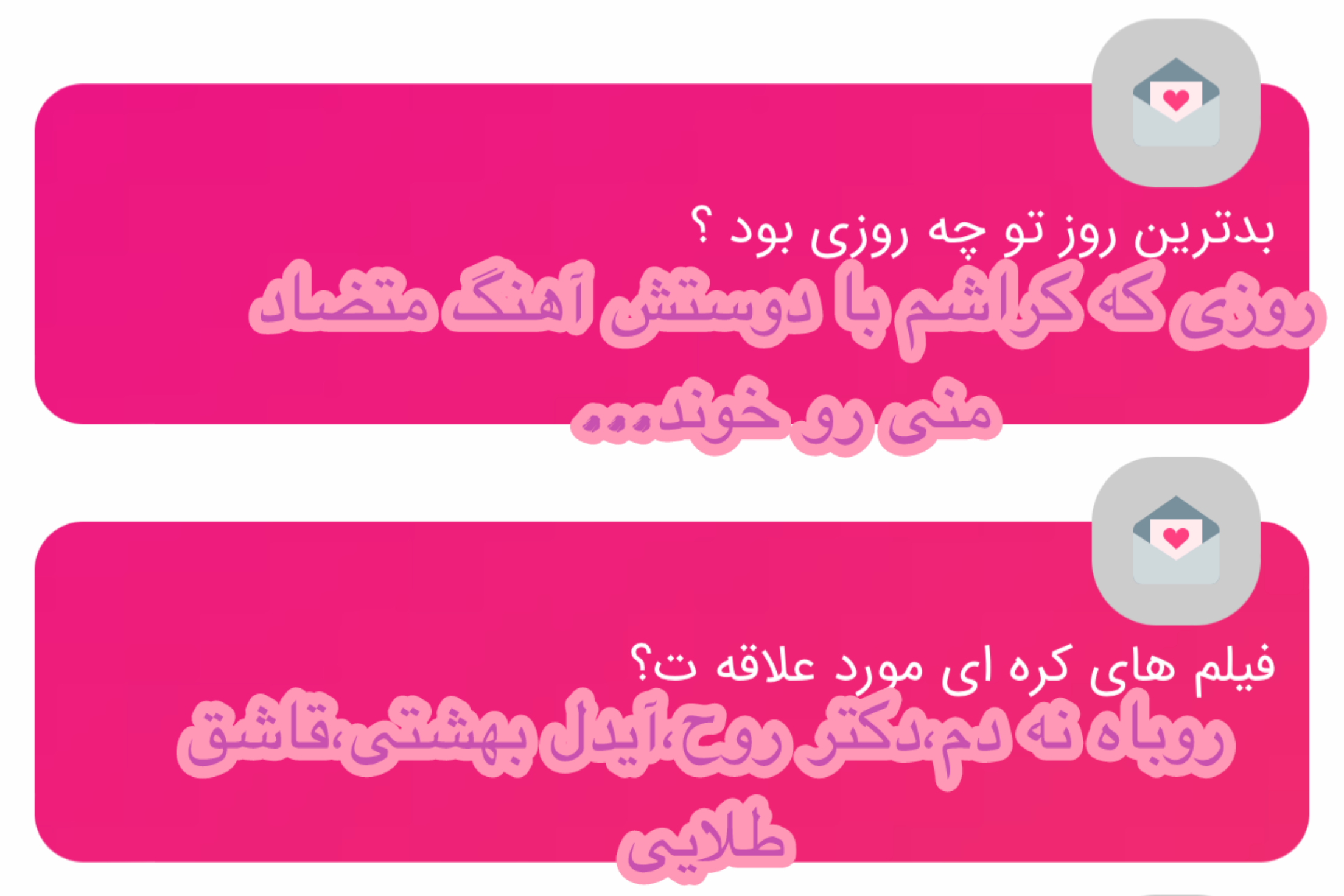 از اینکه سوال میپرسید خودتون جواب میدید اعصابم خورده😡یعنی چی ناشناس من یعنی سوال بپرسید من جواب بدم😐
